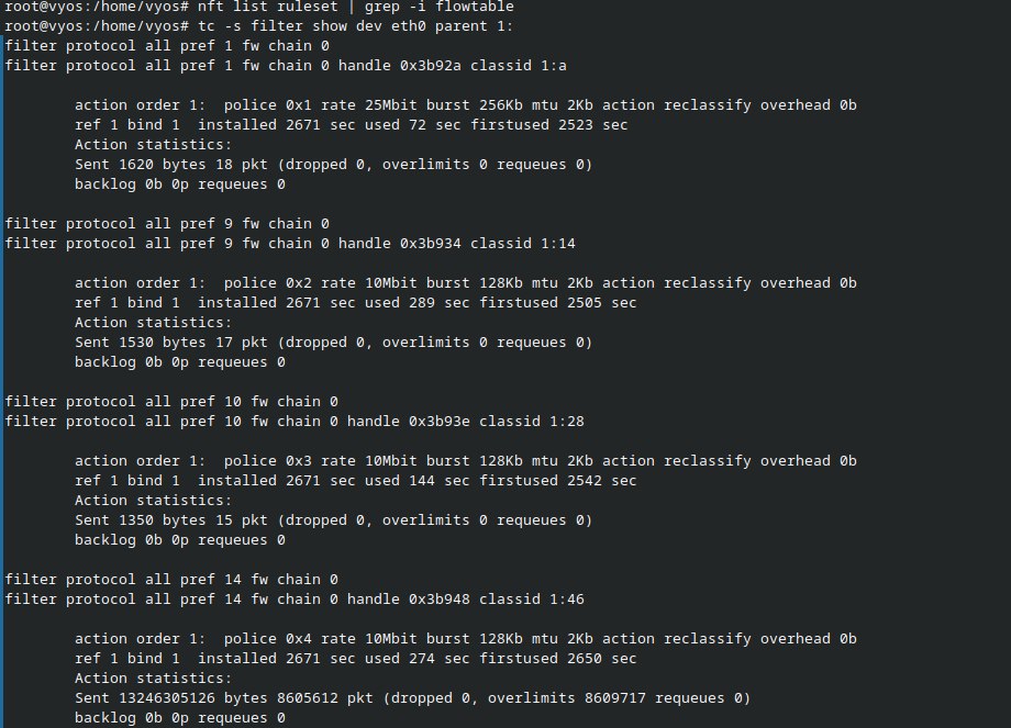 # Packet marking set policy route tc-mark interface 'eth1' set policy route tc-mark rule 10 description 't1' set policy route tc-mark rule 10 set mark '244010' set policy route tc-mark rule 10 source address '172.16.2.2/32' set policy route tc-mark rule 20 description 't2' set policy route tc-mark rule 20 set mark '244020' set policy route tc-mark rule 20 source address '172.16.2.3/32' set policy route tc-mark rule 30 description 't3' set policy route tc-mark rule 30 set mark '244030' set policy route tc-mark rule 30 source address '172.16.2.4/32' set policy route tc-mark rule 40 description 't4' set policy route tc-mark rule 40 set mark '244040' set policy route tc-mark rule 40 source address '172.16.2.5/32' set qos traffic-match-group t1 match t1 mark '244010' set qos traffic-match-group t1 match t2 mark '244020' set qos traffic-match-group t2 match t3 mark '244030' set qos traffic-match-group t3 match t4 mark '244040' set qos traffic-match-group t4 match t5 mark '244050' # Delete delete qos policy shaper UPLOAD-200 # Shaper set qos policy shaper UPLOAD-200 bandwidth '200mbit' # High priority set qos policy shaper UPLOAD-200 class 10 description 'T1' set qos policy shaper UPLOAD-200 class 10 ceiling '25mbit' set qos policy shaper UPLOAD-200 class 10 bandwidth '25mbit' set qos policy shaper UPLOAD-200 class 10 priority '1' set qos policy shaper UPLOAD-200 class 10 burst '256k' set qos policy shaper UPLOAD-200 class 10 queue-type 'fq-codel' set qos policy shaper UPLOAD-200 class 10 match-group t1 # Default priority set qos policy shaper UPLOAD-200 default ceiling '200mbit' set qos policy shaper UPLOAD-200 default bandwidth '25mbit' set qos policy shaper UPLOAD-200 default burst '128k' set qos policy shaper UPLOAD-200 default priority '7' set qos policy shaper UPLOAD-200 default queue-type 'fq-codel' # Middle 1 priority set qos policy shaper UPLOAD-200 class 20 description 'T2' set qos policy shaper UPLOAD-200 class 20 ceiling '200mbit' set qos policy shaper UPLOAD-200 class 20 bandwidth '10mbit' set qos policy shaper UPLOAD-200 class 20 burst '128k' set qos policy shaper UPLOAD-200 class 20 priority '9' set qos policy shaper UPLOAD-200 class 20 queue-type 'fq-codel' set qos policy shaper UPLOAD-200 class 20 match-group t2 # Middle 2 priority set qos policy shaper UPLOAD-200 class 40 description 'T3' set qos policy shaper UPLOAD-200 class 40 ceiling '200mbit' set qos policy shaper UPLOAD-200 class 40 bandwidth '10mbit' set qos policy shaper UPLOAD-200 class 40 burst '128k' set qos policy shaper UPLOAD-200 class 40 priority '10' set qos policy shaper UPLOAD-200 class 40 queue-type 'fq-codel' set qos policy shaper UPLOAD-200 class 40 match-group t3 # Lowest priority set qos policy shaper UPLOAD-200 class 70 description 'T4' set qos policy shaper UPLOAD-200 class 70 ceiling '200mbit' set qos policy shaper UPLOAD-200 class 70 bandwidth '10mbit' set qos policy shaper UPLOAD-200 class 70 burst '128k' set qos policy shaper UPLOAD-200 class 70 priority '14' set qos policy shaper UPLOAD-200 class 70 queue-type 'fq-codel' set qos policy shaper UPLOAD-200 class 70 match-group t4